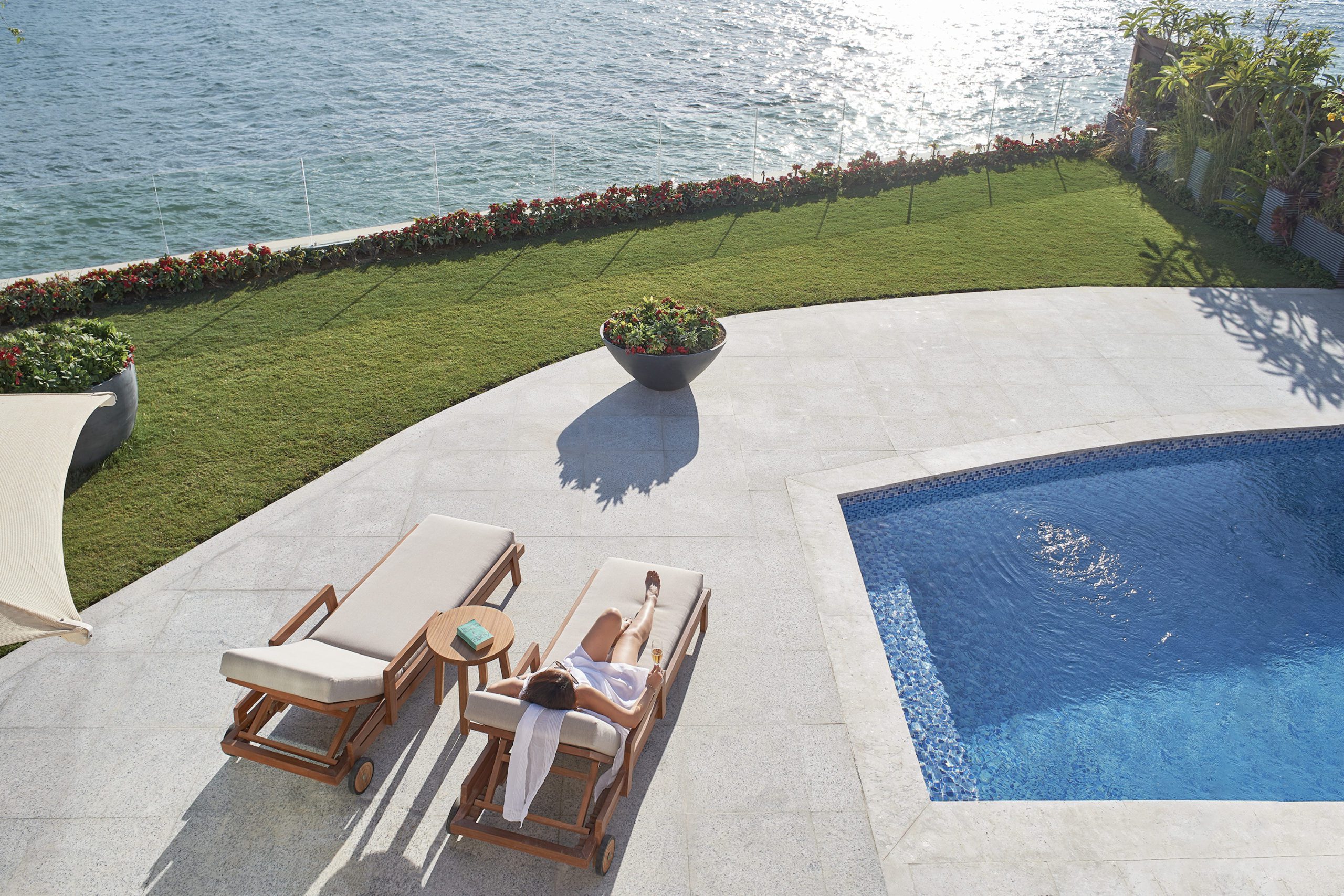The interior design is inspired by the seaside setting, with a colour palette covering the spectrum of blues from cool pastels to vivid tones of the Mediterranean. In an artful setting, the paintings and sculptures reference summer beach holidays, and views of sea and sky enter the villas through large floor to ceiling sliding glass doors that lead directly onto the sun terrace. The mood continues outdoors, where stripy blue chairs and sand-coloured recliners inspire long lazy days in the sun. And it’s just a few short steps from bed to pool or sunbed, the perfect luxury for any well-deserved holiday.